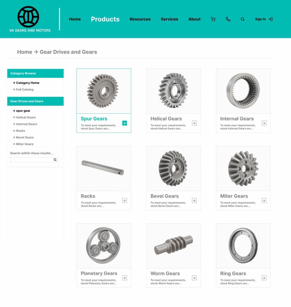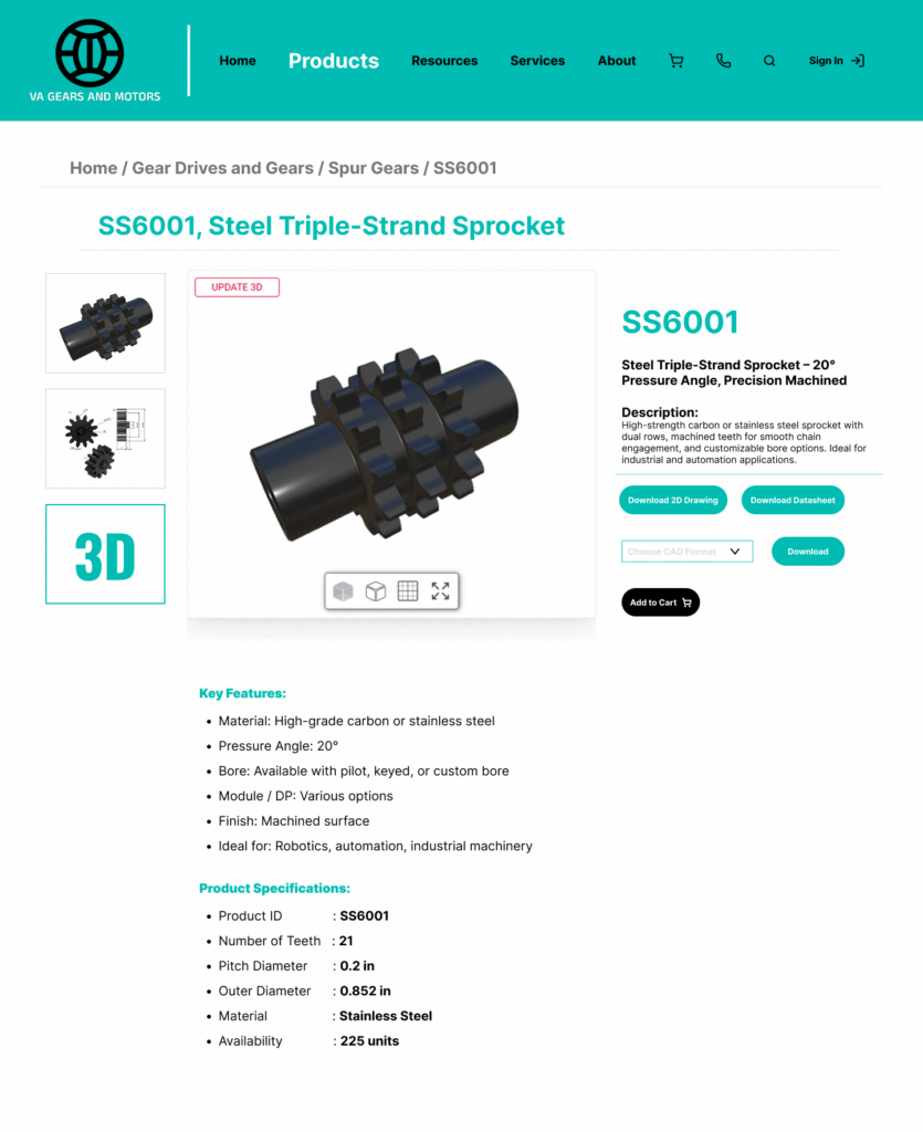 Browse by structured categories (e.g., Gears → Spur Gears → SS6001) for a familiar and intuitive experience.
